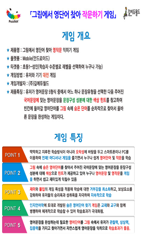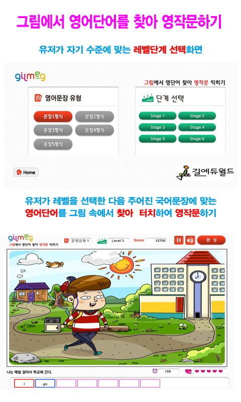 4) 영어문장 내용을 그림으로 나타내고, 그 그림 속에 숨겨져 있는 영어단어를 찾아서 작문연습을 할 수 있는 Mobile용과 PC용 게임을 누구나 손쉽게 영작문을 학습.
